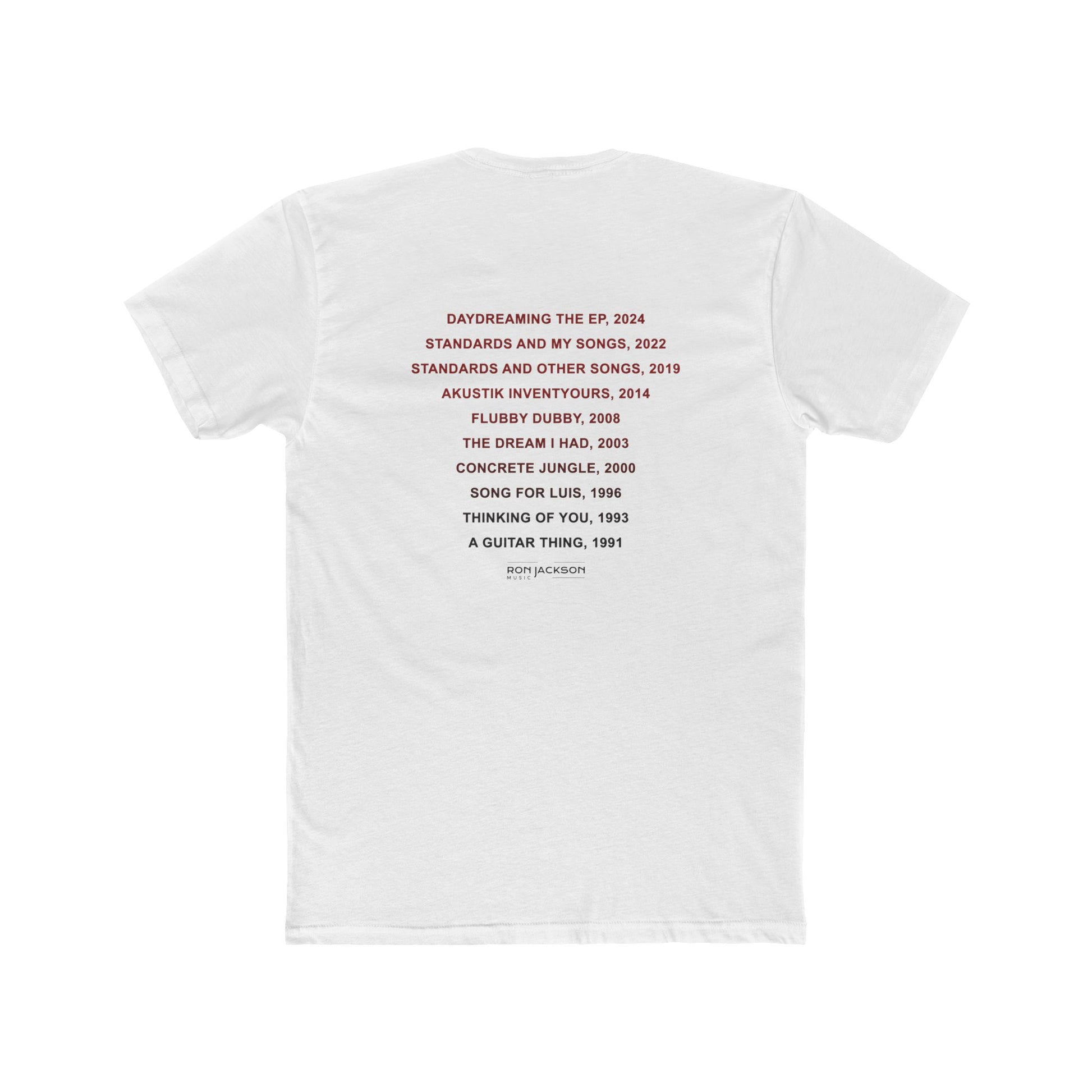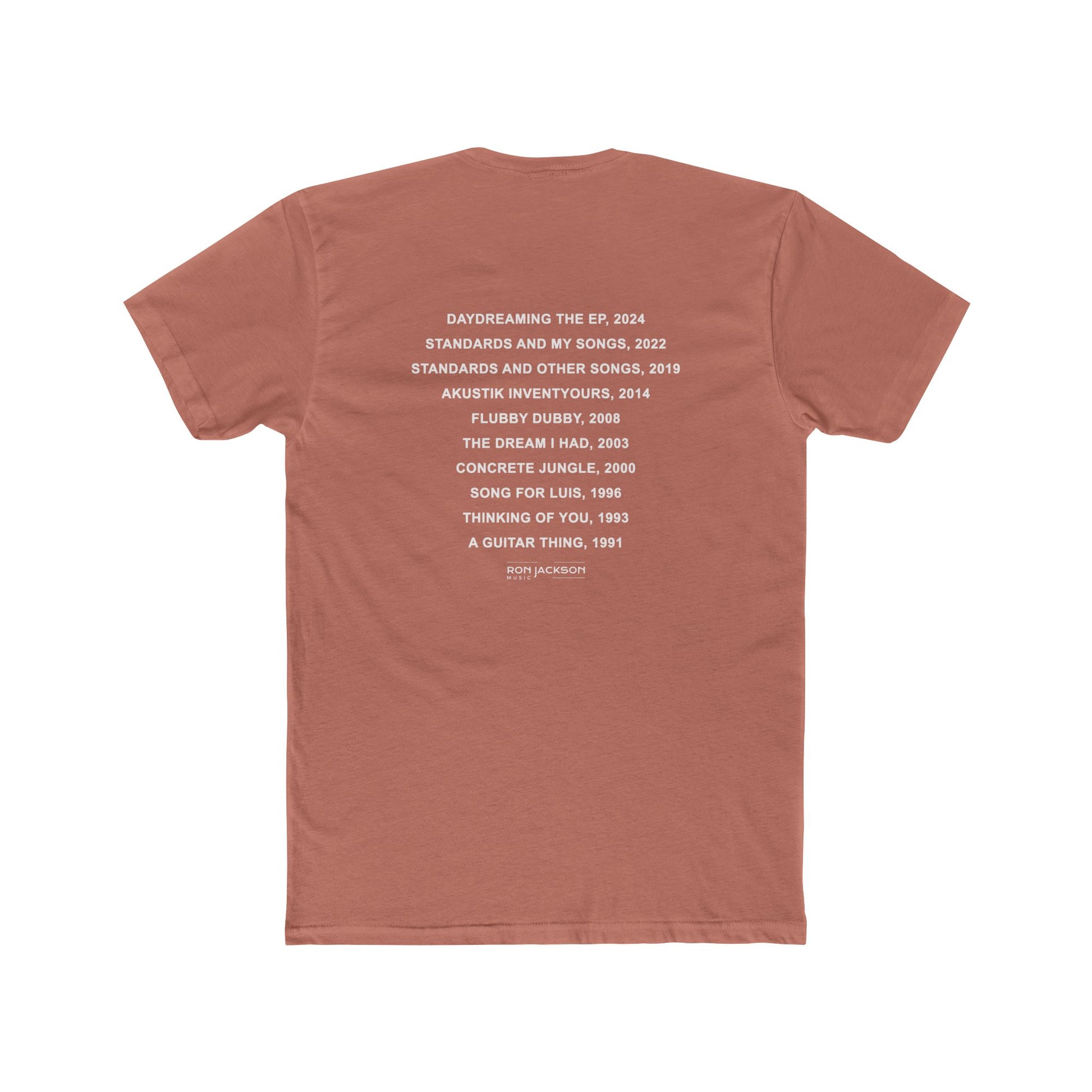 The original artwork commissioned for this collection was created by artist, Jerry Fess. It captures Ron playing his seven-string archtop guitar in a jazz club. The back of the shirt highlights Ron's career, listing his discography as a leader. The inside label is screen-printed with the Ron Jackson Music logo.