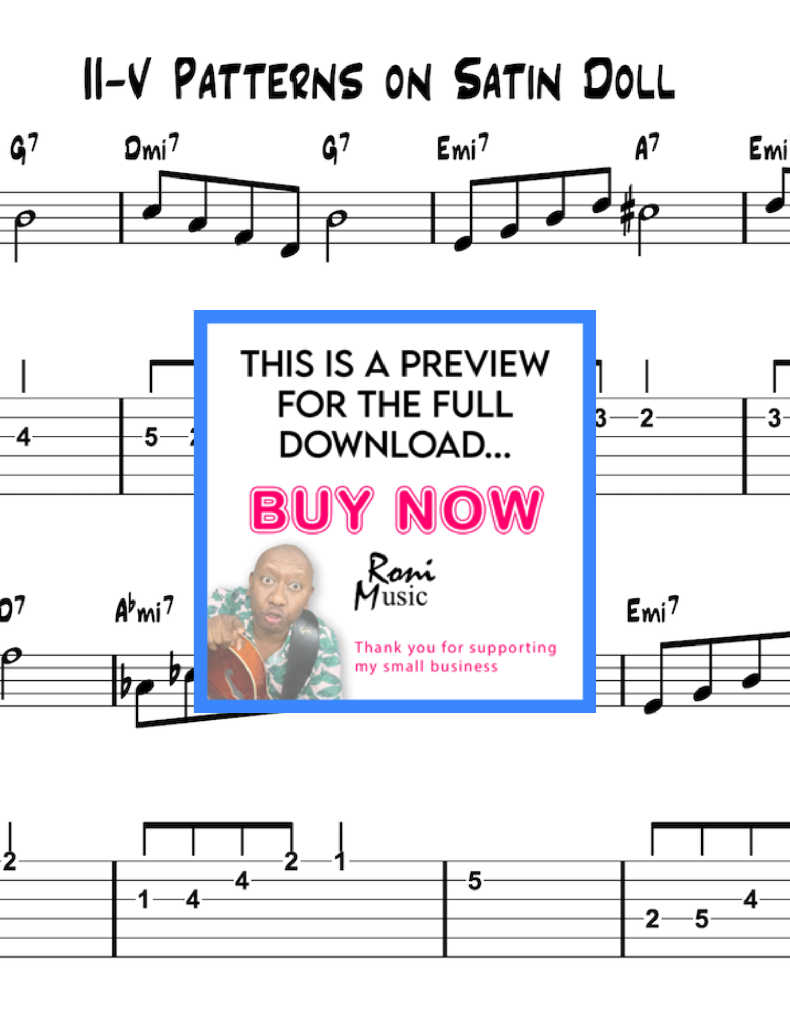 II-V Patterns on "Satin Doll" Lesson with TABS, mp3 and written explanation. An in-depth look at the II-V chord progression, providing a comprehensive breakdown of the changes on "Satin Doll." Music notation and audio files provide a thorough explanation, ensuring a complete learning experience.