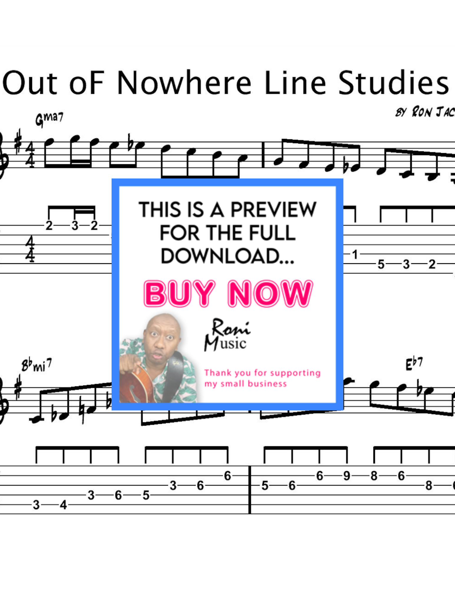 Out of Nowhere Line Studies Lesson uses advanced jazz improv techniques of bebop scales, melodic minor modes, diminished scales and others. Includes sheet music, TABS and written lesson.